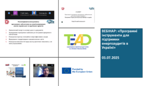 3 липня 2025 року в межах проєкту TEAD відбувся вебінар на тему «Програмні інструменти для підтримки енергоаудитів в Україні». Онлайн-захід зібрав понад 100 учасників з усіх регіонів країни — представників комунальних підприємств, експертів з енергоефективності, викладачів технічних вишів, а також сертифікованих енергоаудиторів.